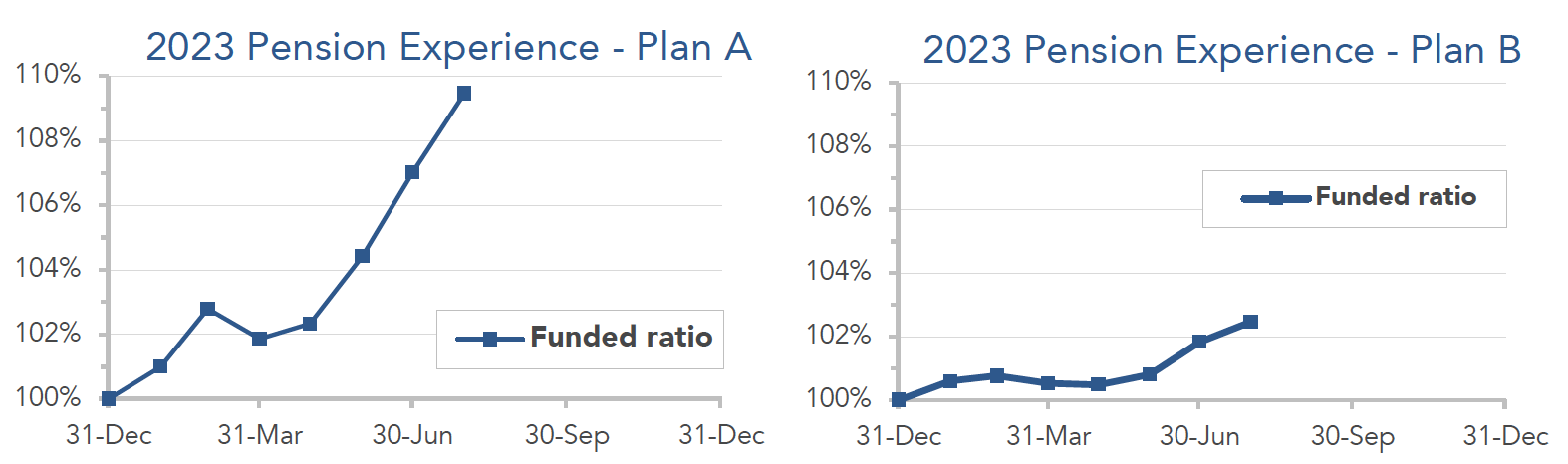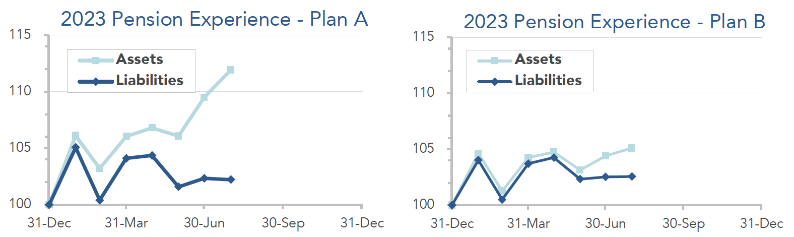 Pension sponsors have enjoyed a strong run so far this year, with stock markets producing double-digit returns while interest rates have held up above 5%. The graphs below show the movement of assets and liabilities during the first seven months of 2023: