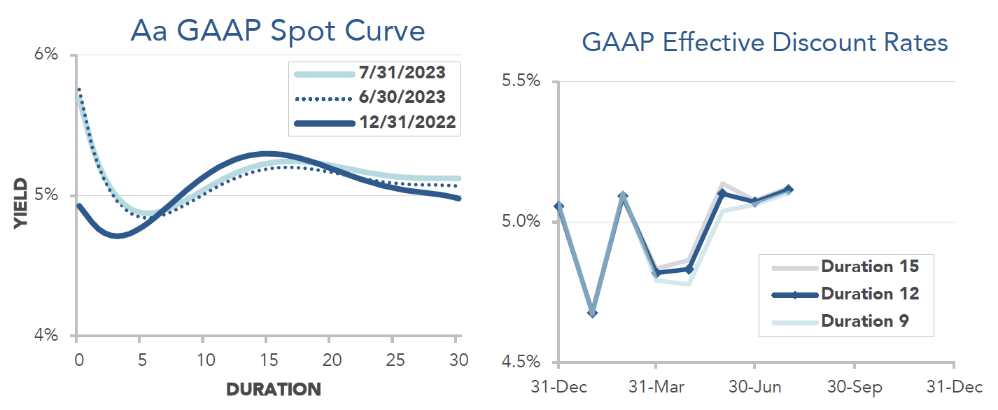 Pension liabilities (for funding, accounting, and de-risking purposes) are driven by market interest rates. The first graph below compares our Aa GAAP spot yield curve at December 31, 2022 and July 31, 2023, and it also shows the movement in the curve last month. The second graph below shows our estimate of movements in effective GAAP discount rates for pension obligations of various duration so far this year: