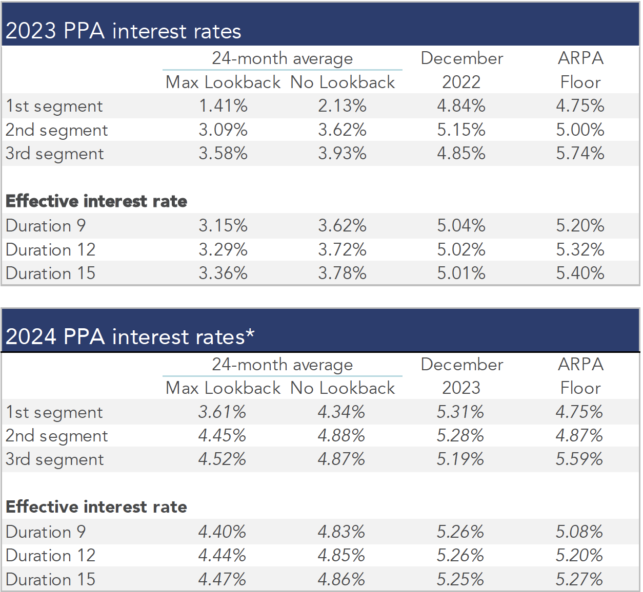 The table below summarizes rates that plan sponsors are required to use for IRS funding purposes for 2023, along with estimates for 2024. Pre-relief, both 24-month averages and December ‘spot’ rates, which are still required for some calculations, such as PBGC premiums, are also included.
