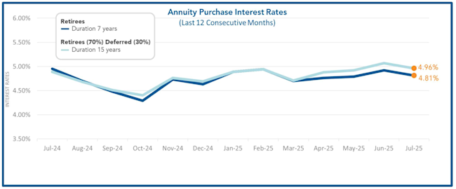 Annuity purchase interest rates remained relatively stable throughout the second quarter of 2025. As noted in the Pension Finance Update for the first half of 2025, strong stock returns outpaced liability growth, contributing to another positive month for pensions. Rates dipped slightly at the beginning of the month but still remain in a favorable position. The average duration 7 rate is 4.81% while the average duration 15 rate stands at 4.96%. With volatility and uncertainty expected to intensify in the markets in the next month with the new tariff extension closing, now may be the best opportunity for plan sponsors to act and capitalize on the current market stability and secure the favorable rates.