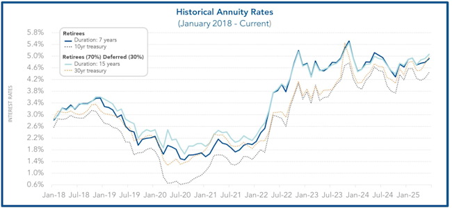As seen below, the 10-year treasury rates correlate with the duration 7 annuity purchase interest rates. Similarly, the 30-year treasury rates correlate with the duration 15 annuity purchase interest. Since the start of 2025, the spread between the 10-year and 30-year Treasury rates has widened by 30 basis points. Both rates started lower at the beginning of the month but have since trended upwards. The 10-year Treasury rate began the month at 4.26% and has seen an increase of 4.42%. Similarly, the 30-year Treasury rate started at 4.78% and has increased to 4.94%. With potential market volatility and uncertainty expected later in the year, plan sponsors are encouraged to take advantage of current market conditions and de-risk while pricing and rates remain favorable.