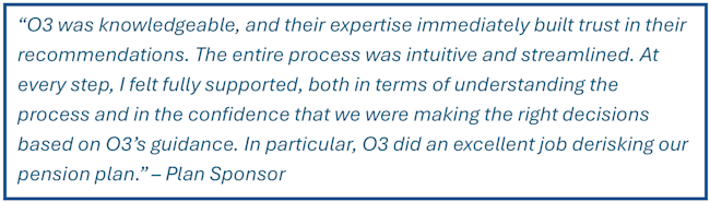 Timing is a critical component when it comes to derisking. In June 2024, A Northeastern medical company discovered that its pension plan—already nearly fully funded—could not be terminated as initially planned, prompting the sponsor to engage October Three for a revised liability-transfer strategy. Working closely with the investment advisor, October Three executed a hybrid approach combining a Pension Risk Transfer annuity and lump-sum payouts, negotiated $1 million in annuity premium savings, and achieved full termination by year-end.