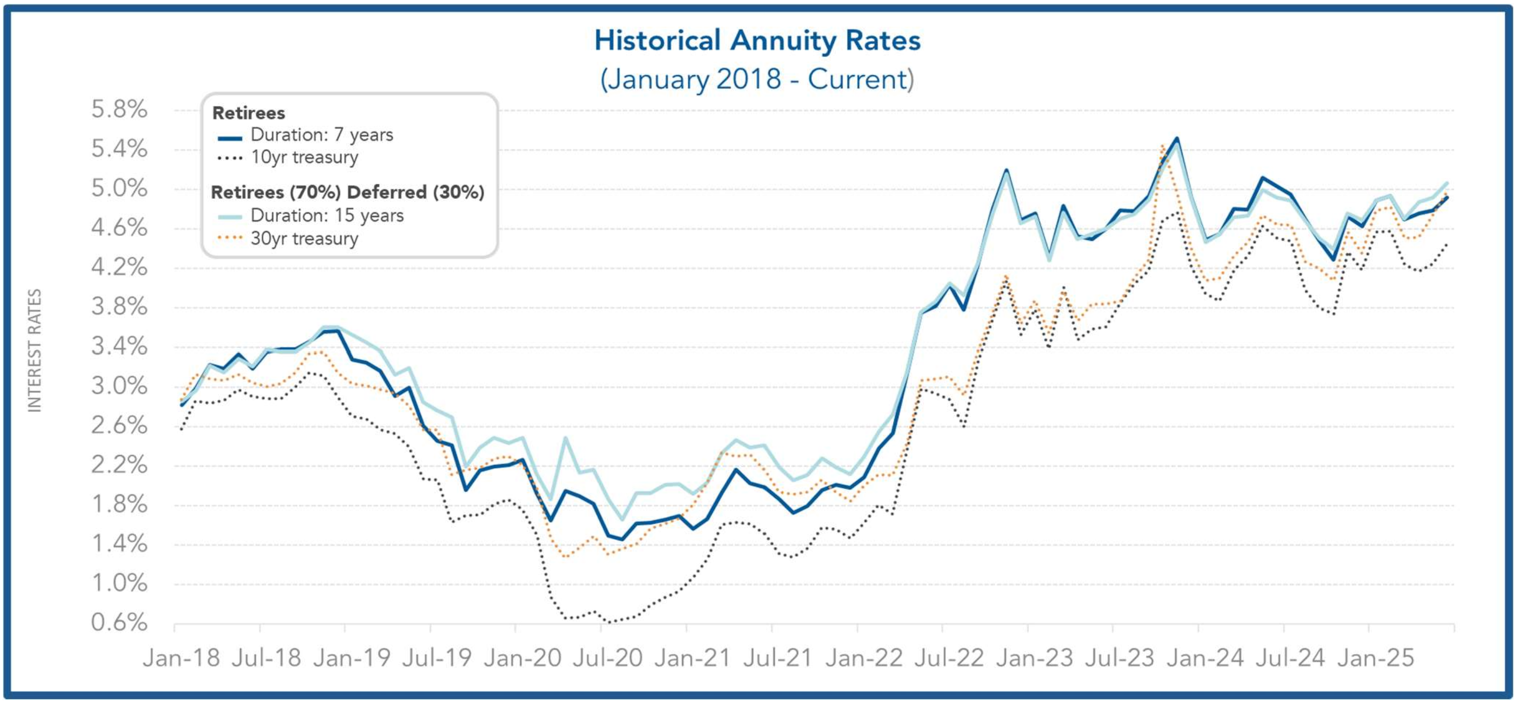 Moving into the second half of 2025, rates are still showing stability and remain in a favorable position. With the recent news of the tariff extension now in effect through August 1, 2025, plan sponsors have a renewed window of opportunity to implement de-risking strategies in a relatively stable market environment.