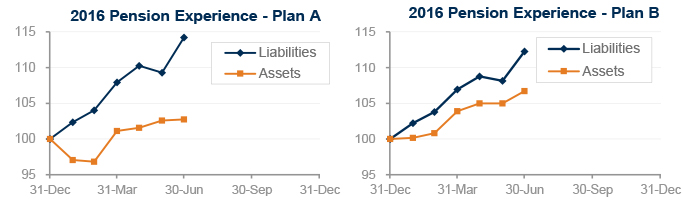 Financial markets have been roiled in the past week by Brexit, adding to pain pension sponsors had already been suffering this year. Both model pension plans we track1 suffered setbacks in June – Plan A lost 4% last month, while Plan B was off 2%. Through the first half of 2016, Plan A is now down 10% and Plan B is down 5%: