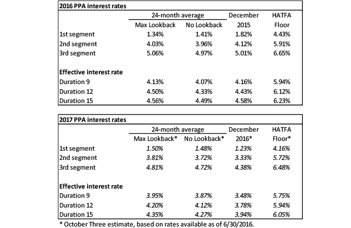 The table below summarizes rates that plan sponsors are required to use for IRS funding purposes for 2016, along with estimates for 2017. Pre-relief, both 24-month averages and December ‘spot’ rates, which are still required for some calculations, such as PBGC premiums, are also included.