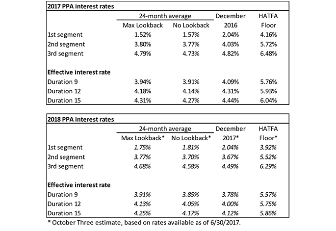 The table below summarizes rates that plan sponsors are required to use for IRS funding purposes for 2017, along with estimates for 2018. Pre-relief, both 24-month averages and December ‘spot’ rates, which are still required for some calculations, such as PBGC premiums, are also included.