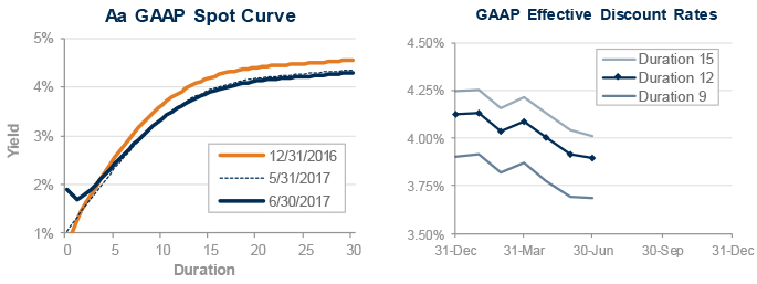 Pension liabilities (for funding, accounting, and de-risking purposes) are now driven by market interest rates. The graph on the left compares our Aa GAAP spot yield curve at December 31, 2016, and June 30, 2017, and also shows the movement in the curve last month. The graph on the right shows our estimate of movements in effective GAAP discount rates for pension obligations of various durations during 2017: