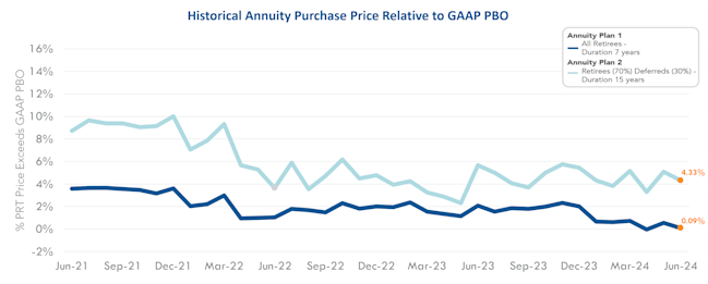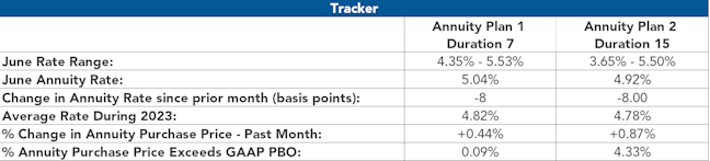 The graph below shows the spread between annuity purchase price above GAAP projected benefit obligation (PBO). We refer to GAAP PBO and accounting book value interchangeably. In June, we observed that the spread between annuity purchase price above GAAP PBO for both plans narrow slightly. For Annuity Plan 2, the spread decreased to 4.33% above GAAP PBO, while for Annuity Plan 1 it decreased to 0.09% above GAAP PBO. An increase in annuity purchase rates inversely lowers annuity purchase prices relative to accounting book value. Please note that the below PBO calculations exclude future overhead costs paid by plan sponsors to retain participants in the plan. Administrative expenses and PBGC premiums are examples of these overhead costs. Future overhead costs would narrow the spread, though the extent is plan specific.