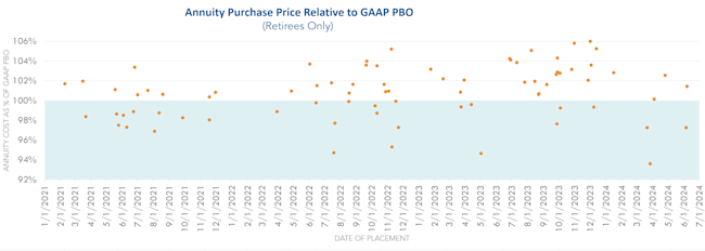 The graph below represents the annuity purchase price relative to GAAP projected benefit obligation (PBO) of the retiree cases placed by October Three Annuity Services since 2021. In 2023, annuity purchase cost for retirees was on average 102.52% of the accounting book value. Since 2021, the average purchase cost was 101.00% of GAAP PBO. At the end of the first quarter of 2024, October Three Annuity services closed two placements below GAAP PBO. With attractive rates and aggressive pricing from carriers, one transaction closed at 97.25% of GAAP PBO and the other at 93.59% of GAAP PBO. Thus far, the 2024 average annuity purchase cost of retiree transactions placed by October Three Annuity Services is 99.29% of GAAP PBO.