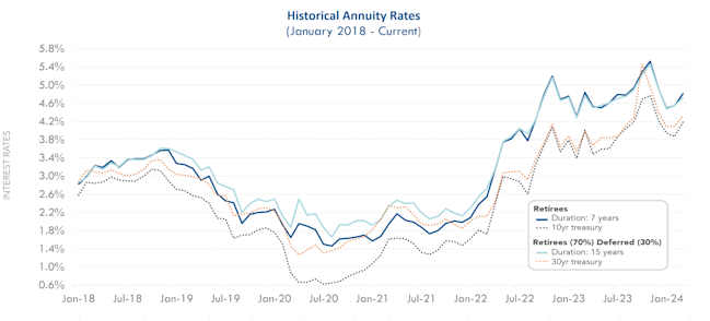 For the first few months of 2024, annuity purchase interest rates remained stable, showing an upward trend trajectory, but have since started to present a steady decline. The Fed has also indicated that there may be 1-2 rate cuts in the coming months. As mentioned in the Pension Finance Update, this year, higher interest rates and robust stock market returns have brought more good news for pension sponsors. This month saw a marginal decrease in interest rates, with both the average duration 7 annuity rate and average duration 15 annuity rate dropping by 8 basis points. Despite the slight decrease, the rates for this month remain among the highest observed in 2024 thus far. The last two quarters emerge as the peak activity period in the pension risk transfer marketplace leading insurers to encounter capacity limitations or calendar conflicts. This should serve as a strong incentive for plan sponsors to mitigate their pension obligations as early as possible.