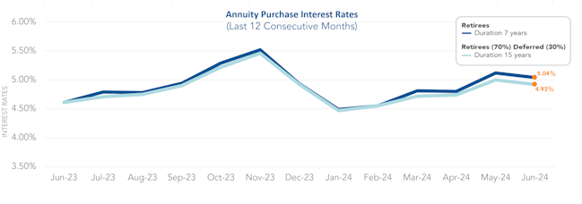 Annuity purchase interest rates slightly decreased this month; however they still rank among the highest seen so far in 2024.