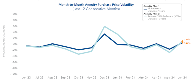 Although the graph below shows a month-to-month fluctuation, annuity purchase costs fluctuate daily, and as we can see, this month reveals a small uptick in costs for both plans. The annuity purchase price increased for Annuity Plan 1 by 0.44% and increased for Annuity Plan 2 by 0.87%. Despite the rise in the annuity purchase prices for these hypothetical plans, they remain among the lowest we’ve witnessed so far this year. The sooner a plan sponsor enters the Pension Risk Transfer marketplace, the greater the opportunity to leverage favorable shifts within the annuity purchase interest rates and prices.