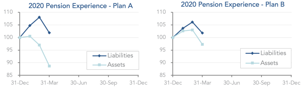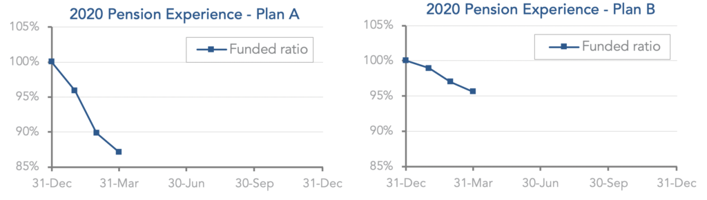Tumbling stock markets dealt another blow to pension sponsors in March. Both model plans we track[1] lost ground: Plan A lost 3% in March, ending the quarter 13% lower than at the end of 2019, while Plan B slipped more than 1% and is now down more than 4% for the year: