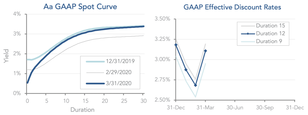 Pension liabilities (for funding, accounting, and de-risking purposes) are driven by market interest rates. The first graph below compares our Aa GAAP spot yield curve at December 31, 2019 and March 31, 2020 and it also shows the movement in the curve last month. The second graph below shows our estimate of movements in effective GAAP discount rates for pension obligations of various duration during 2020: