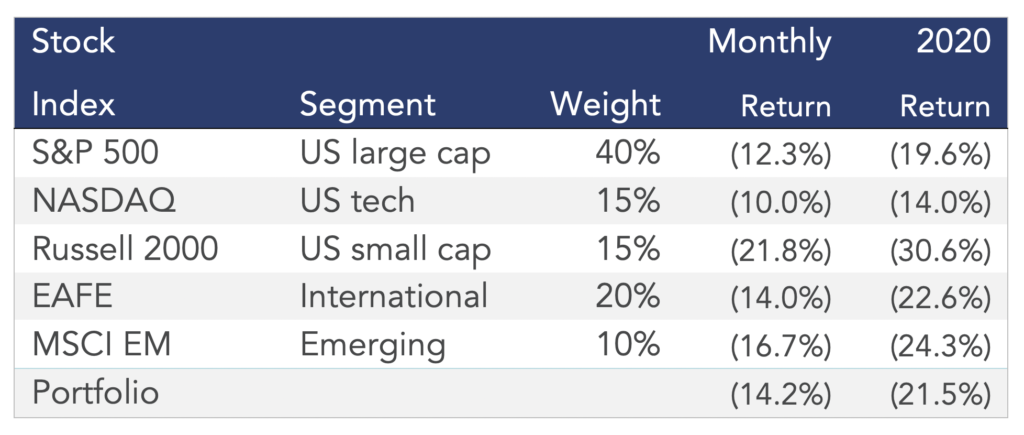 Overall, our traditional 60/40 portfolio lost more than 8% in March and is now down more than 11% for the year, while the conservative 20/80 lost 6% last month and is now down 3% through the first quarter of 2020.
