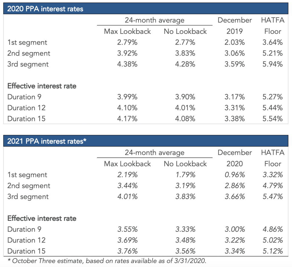 The table below summarizes rates that plan sponsors are required to use for IRS funding purposes for 2020, along with estimates for 2021. Pre-relief, both 24-month averages and December ‘spot’ rates, which are still required for some calculations, such as PBGC premiums, are also included.