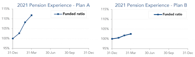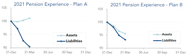 Pension finances enjoyed another good month in March, capping the best quarter in memory, led by higher interest rates with stock markets playing a supporting role. Both model plans we track[1] gained ground last month: Plan A gained 4% and is now up more than 11% for the year, while the more conservative Plan B added 1% and is now up more than 2% through the first quarter of 2021: