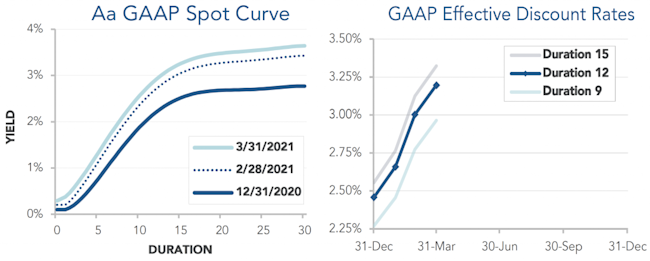 Pension liabilities (for funding, accounting, and de-risking purposes) are driven by market interest rates. The first graph below compares our Aa GAAP spot yield curve at December 31, 2020 and March 31, 2021, and it also shows the movement in the curve last month. The second graph below shows our estimate of movements in effective GAAP discount rates for pension obligations of various duration during 2021 so far: