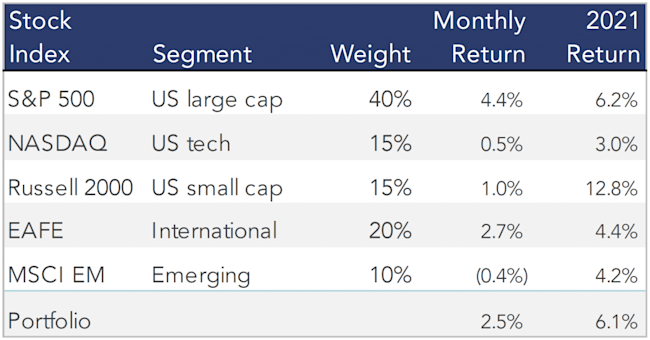 Stocks were mostly higher again in March and all major indexes are ahead at least 3% this year. A diversified stock portfolio gained more than 2% in March and is now up 6% for the year: