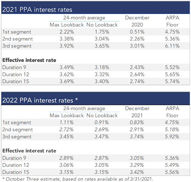 The table below summarizes rates that plan sponsors are required to use for IRS funding purposes for 2021, along with estimates for 2022, reflecting the new law (ARPA). Pre-relief, both 24-month averages and December ‘spot’ rates, which are still required for some calculations, such as PBGC premiums, are also included.