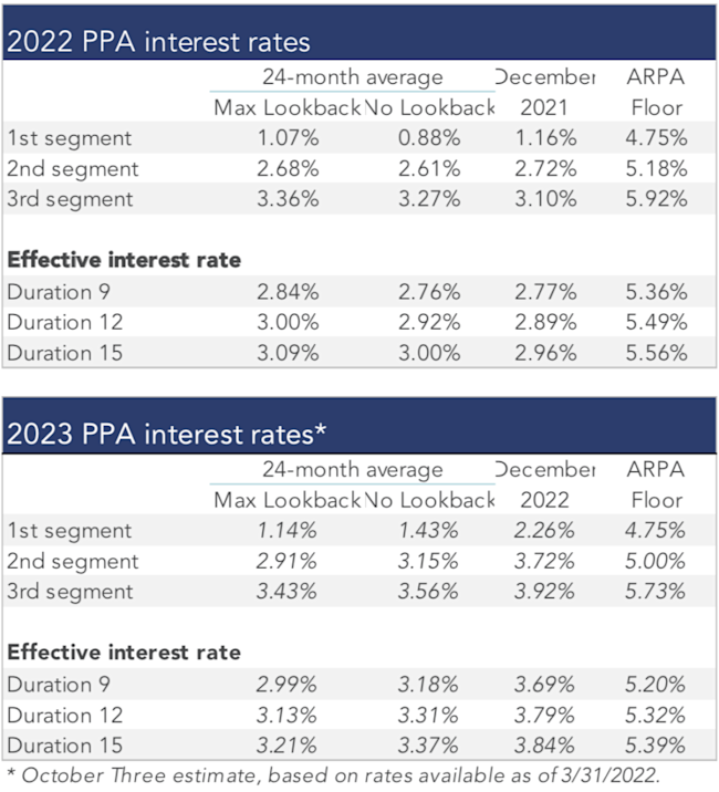 The table below summarizes rates that plan sponsors are required to use for IRS funding purposes for 2022, along with estimates for 2023. Pre-relief, both 24-month averages and December ‘spot’ rates, which are still required for some calculations, such as PBGC premiums, are also included.