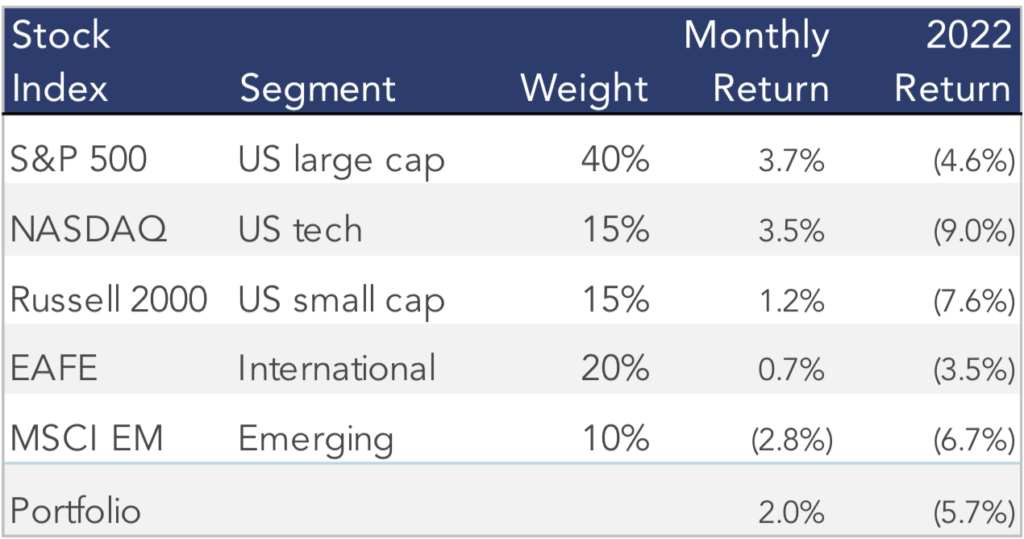 Stocks bounced back in March, led by US markets that had dropped the most during January and February. A diversified stock portfolio gained 2% in March, ending the first quarter down 5%-6%: