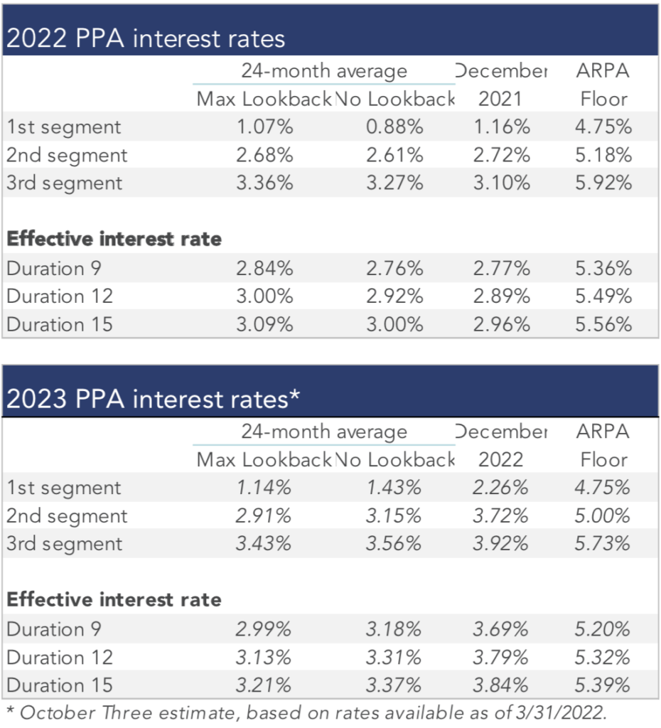 The table below summarizes rates that plan sponsors are required to use for IRS funding purposes for 2022, along with estimates for 2023. Pre-relief, both 24-month averages and December ‘spot’ rates, which are still required for some calculations, such as PBGC premiums, are also included.