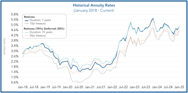 As shown below, the 10-year Treasury rate, which correlates to the duration 7 annuity purchase rate has dropped to about 4.24%. Meanwhile, the 30-year Treasury rate which ties similarly to the duration 15 annuity purchase rate has dropped to 4.51%. However, since the start of March, both the 10-year and 30-year Treasury rates have seen some uptick. The Pension Finance Update, tells us pension funding suffered their worst monthly loss since 2022 due to low stock market returns and low interest rates. Despite the recent decline in annuity purchase interest rates, plan sponsors should not be discouraged from considering an annuity purchase for their plan because as shown below, annuity purchase rates still remain higher than historical averages. Annuity purchase rates remain in a favorable position, offering attractive pricing opportunities. Given the unpredictability of rates and pension funding status, plan sponsors are highly encouraged to connect with an annuity search firm to get data in order and identify a derisking strategy that aligns with their goals. This proactive approach ensures they are well-positioned to act when market conditions become favorable.