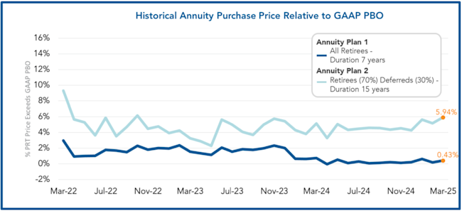 In March, the average duration 7 annuity purchase interest rate and the average duration 15 rate were almost neck and neck at 4.70% and 4.71% respectively. The first two months of 2025 saw a steady upward trend in annuity purchase interest rates. However, we have observed the first decline of the year at roughly a 23-basis point decrease since the prior month for both rates. A decrease in annuity purchase interest rates corresponds to an increase in annuity purchase costs.