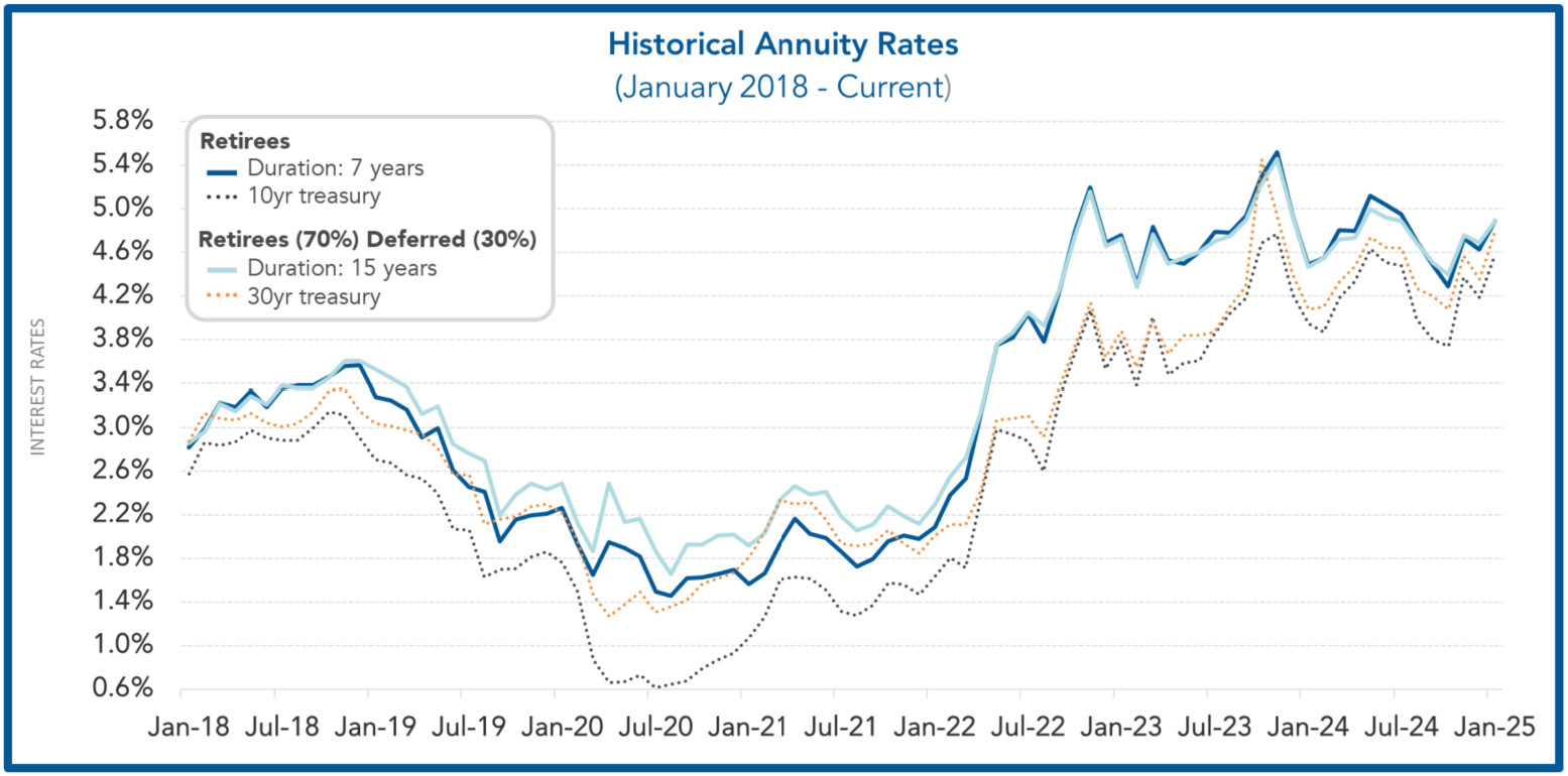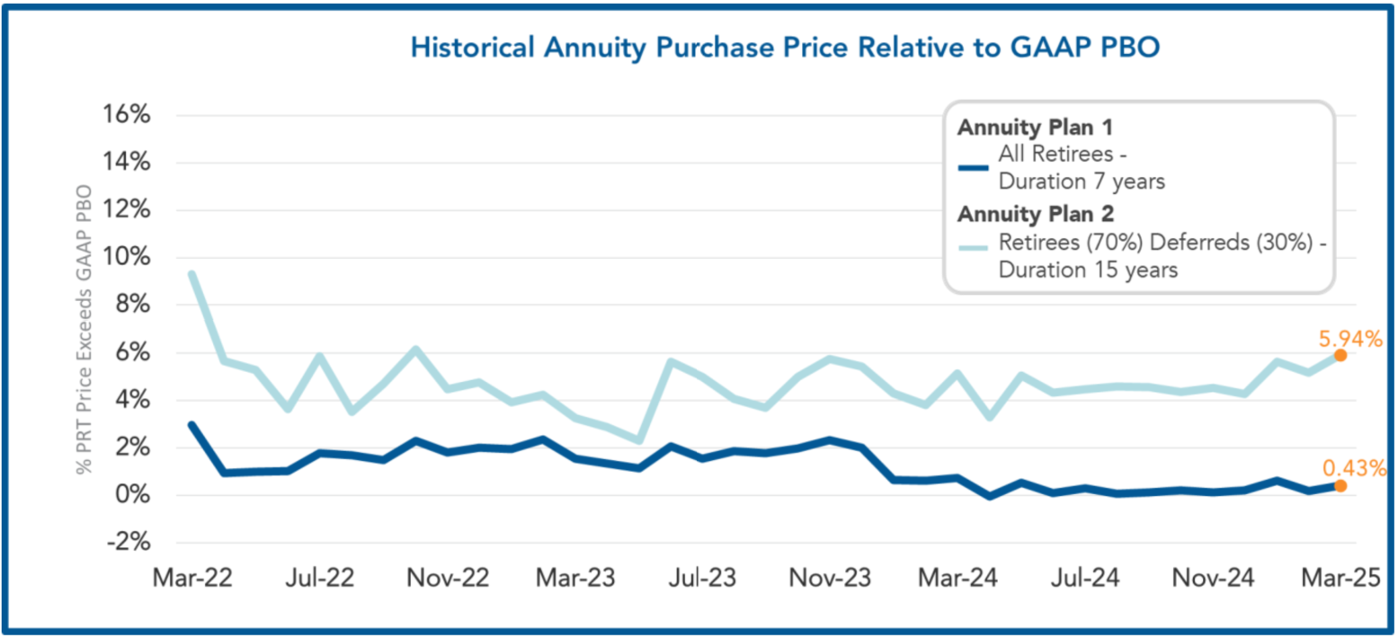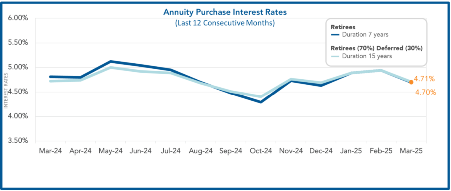 In March, the average duration 7 annuity purchase interest rate and the average duration 15 rate were almost neck and neck at 4.70% and 4.71% respectively. The first two months of 2025 saw a steady upward trend in annuity purchase interest rates. However, we have observed the first decline of the year at roughly a 23-basis point decrease since the prior month for both rates. A decrease in annuity purchase interest rates corresponds to an increase in annuity purchase costs.