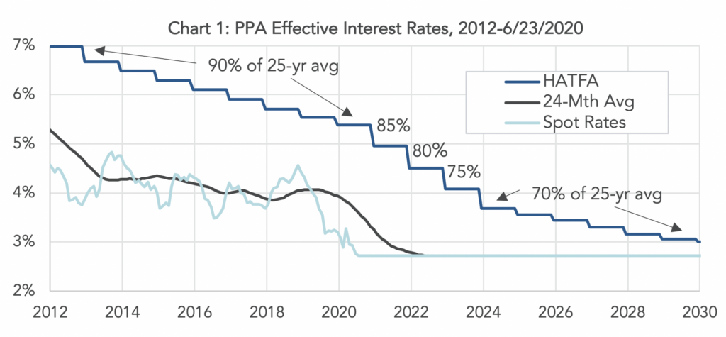 Back at the beginning of 2019, we were projecting that market rates would be higher than HATFA rates as early as 2023. Because of continued 2020 rate declines, it looks like sponsors will, however, be “stuck with” lower HATFA 25-year average rates for the foreseeable future. (In our first 2020 article on these issues we discussed the interaction of HATFA rates and market rates in detail.) As the chart below shows, HATFA rates will, per the statute, begin to “ratchet down” by 5 percentage points per year beginning in 2021, resulting in lower valuation interest rates and higher liability valuations.