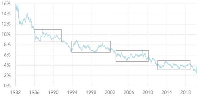 With regard to this question – the direction of interest rates, and the relationship between rates and spreads, following a significant negative market event – it may be useful to consider (1) the long-run trend of interest rates and (2) what happened to interest rates after the 2008 Global Financial Crisis.