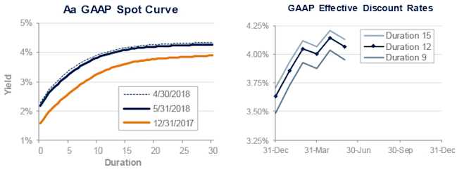 Pension liabilities (for funding, accounting, and de-risking purposes) are now driven by market interest rates. The graph on the left compares our Aa GAAP spot yield curve at December 31, 2017, and May 31, 2018, and it also shows the movement in the curve last month. The graph on the right shows our estimate of movements in effective GAAP discount rates for pension obligations of various duration during 2018: