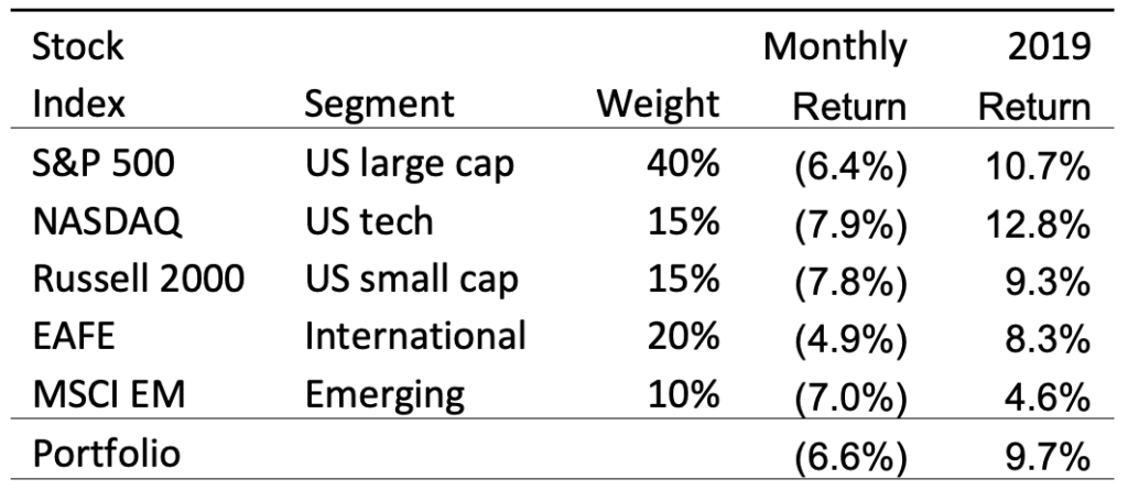 Stocks lost 5%-8% in May but remain up by a decent amount so far in 2019. The table below summarizes returns on various stock indexes included in our model portfolio: