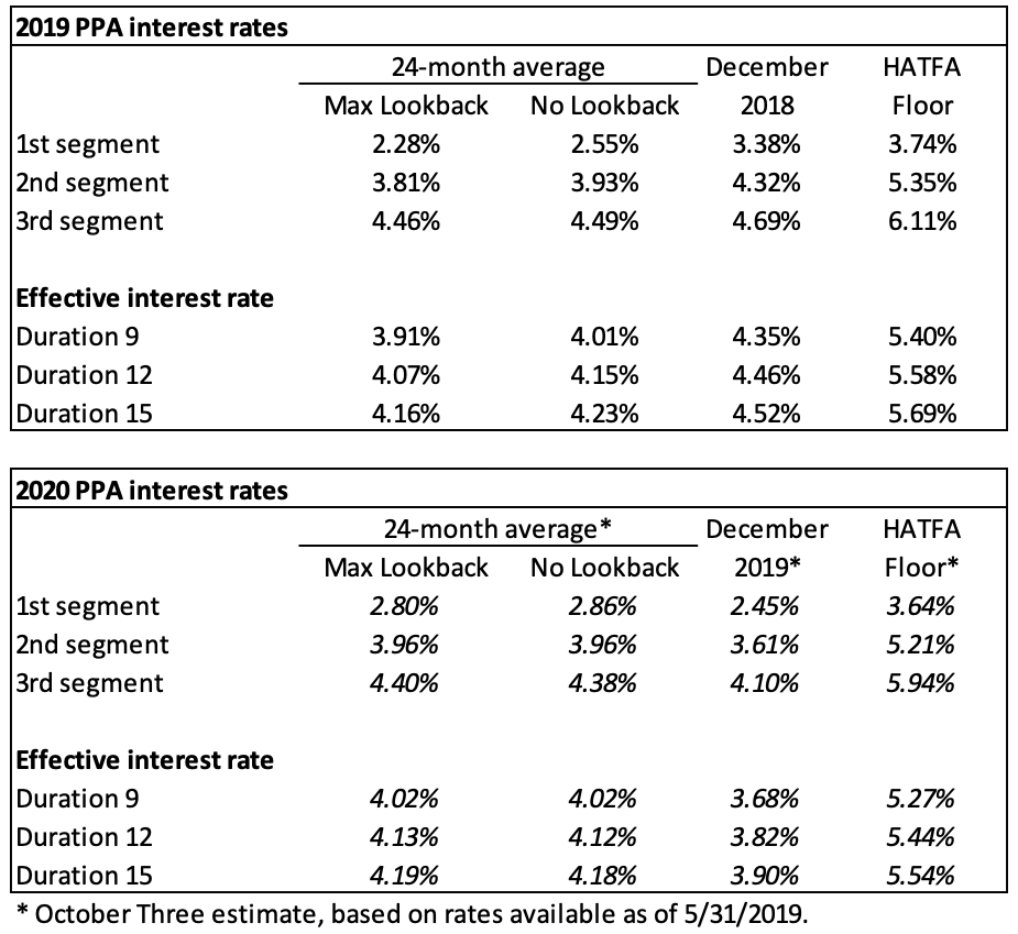 The table below summarizes rates that plan sponsors are required to use for IRS funding purposes for 2019, along with estimates for 2020. Pre-relief, both 24-month averages and December ‘spot’ rates, which are still required for some calculations, such as PBGC premiums, are also included.