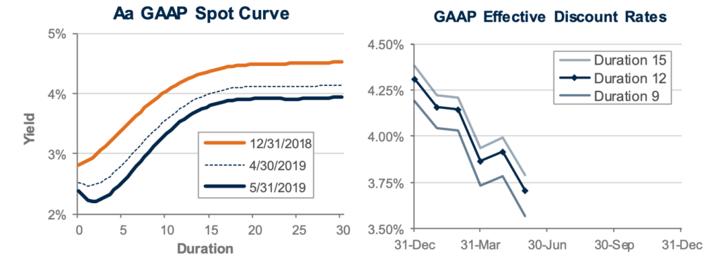 Pension liabilities (for funding, accounting, and de-risking purposes) are driven by market interest rates. The graph on the left compares our Aa GAAP spot yield curve at December 31, 2018, and May 31, 2019, and it also shows the movement in the curve last month. The graph on the right shows our estimate of movements in effective GAAP discount rates for pension obligations of various duration during 2019: