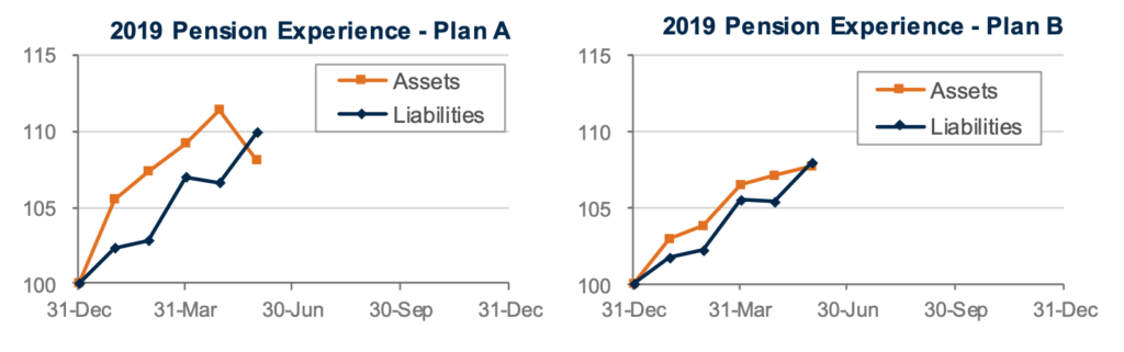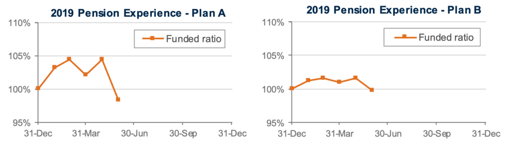 Interest rates have fallen more than 0.5% this year, pushing pension liabilities higher. Combined with the stock market correction in May, pension sponsors now find themselves treading water or modestly underwater this year. The graphs below show the progress of assets and liabilities for our two model plans through the first five months of 2019: