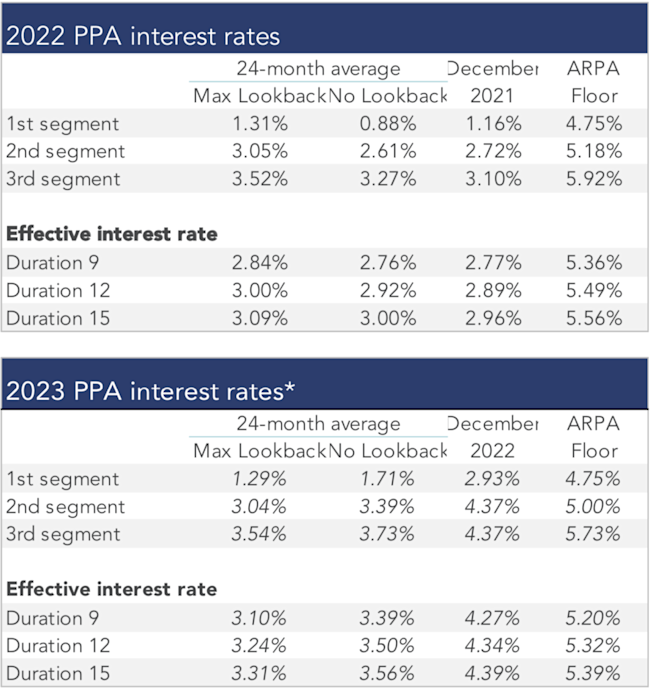 The table below summarizes rates that plan sponsors are required to use for IRS funding purposes for 2022, along with estimates for 2023. Pre-relief, both 24-month averages and December ‘spot’ rates, which are still required for some calculations, such as PBGC premiums, are also included.