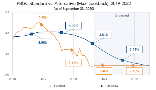 While (as we discussed in our article on this topic last year) in 2019 the spot rate method provided some advantage (but at the cost of locking in use of that method for five years and creating a problem for some sponsors that moved to the standard method in 2019), clearly for 2020 and 2021, using the alternative/24-month average method provides a significantly higher UVB valuation interest rate. (Indeed, the size of the spread is unprecedented.)