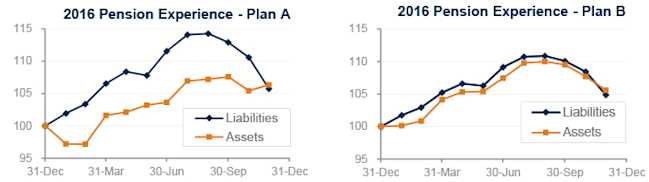 The graphs below show the movement of assets and liabilities for our two model plans this year: