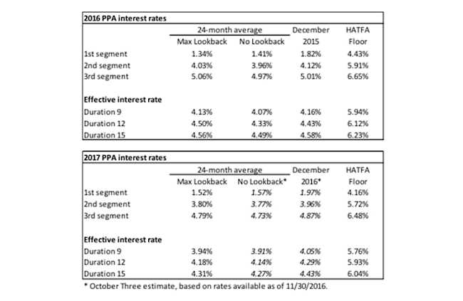 The table below summarizes rates that plan sponsors are required to use for IRS funding purposes for 2016, along with estimates for 2017. Pre-relief, both 24-month averages and December ‘spot’ rates, which are still required for some calculations, such as PBGC premiums, are also included.