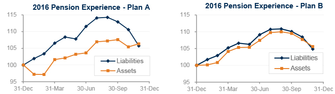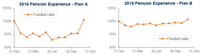 Well, that was a weird month. It started with the Cubs winning the World Series and ended as the best month for pension sponsors this year. In-between, we had a presidential election with a surprising outcome. So…pensions. Both model pension plans we track1 enjoyed strong improvements in funded status during November – Plan A improved by 5% and Plan B by more than 1% last month – pushing both plans into positive territory for the year, up almost 1%.