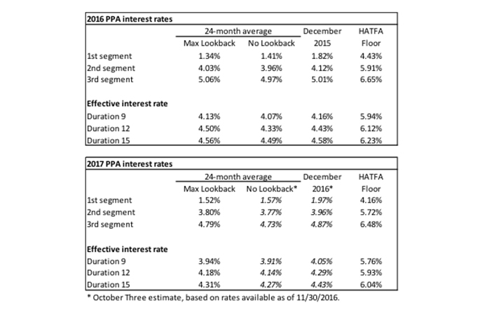 The table below summarizes rates that plan sponsors are required to use for IRS funding purposes for 2016, along with estimates for 2017. Pre-relief, both 24-month averages and December ‘spot’ rates, which are still required for some calculations, such as PBGC premiums, are also included.
