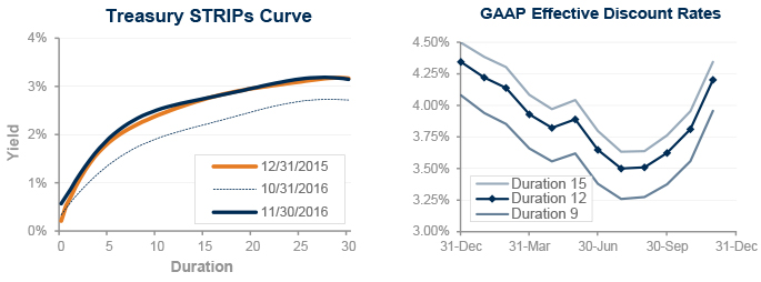 Pension liabilities (for funding, accounting, and de-risking purposes) are now driven by market interest rates. The graph on the left compares Treasury STRIPs yields at December 31, 2015 and November 30, 2016, and also shows the movement in rates last month. The graph on the right shows our estimate of movements in effective GAAP discount rates for pension obligations of various duration during 2016: