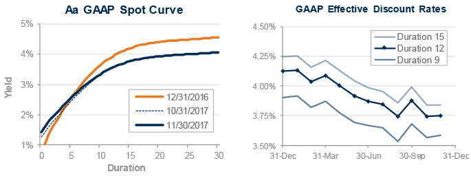 Pension liabilities (for funding, accounting, and de-risking purposes) are now driven by market interest rates. The graph on the left compares our Aa GAAP spot yield curve at December 31, 2016, and November 30, 2017, and it also shows the (small) movement in the curve last month. The graph on the right shows our estimate of movements in effective GAAP discount rates for pension obligations of various durations during 2017: