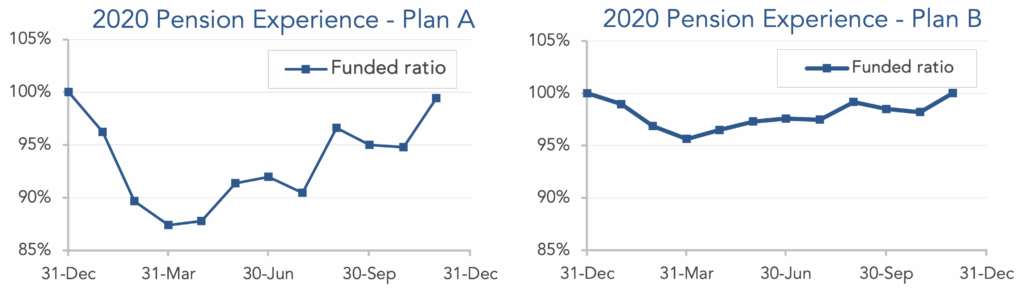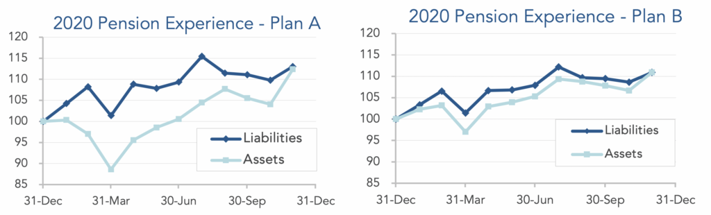 At the beginning of 2020, few people anticipated that interest rates, already at record low levels, would move lower still, or that stock markets, already at record highs, would produce double-digit returns, but here we are. The good news for sponsors is that the stock market rally has effectively closed a “hole” in pension finances that emerged in the first quarter, leaving plans in a position similar to where they began the year. The graphs below show the movement of assets and liabilities for our two model plans during the first eleven months of the year: