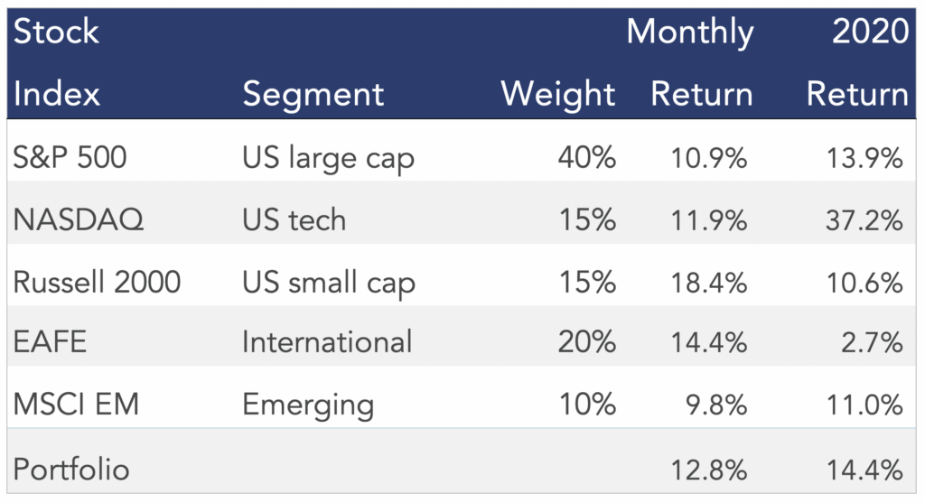 Stock markets continued their remarkable 2020 recovery in November, with all major indexes adding 10% or more last month. For the year, a diversified stock portfolio is now up more than 14% through November, with tech (NASDAQ) overperforming massively while international markets lag.