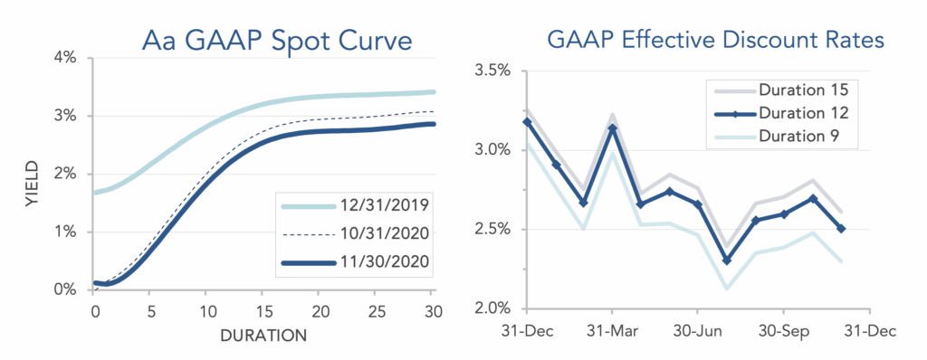 Pension liabilities (for funding, accounting, and de-risking purposes) are driven by market interest rates. The first graph below compares our Aa GAAP spot yield curve at December 31, 2019 and November 30, 2020, and it also shows the decrease in the curve last month. The second graph below shows our estimate of movements in effective GAAP discount rates for pension obligations of various duration during 2020: