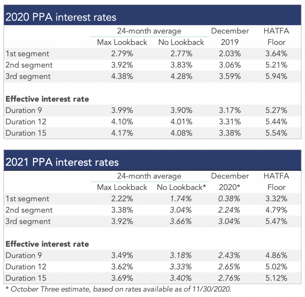 The table below summarizes rates that plan sponsors are required to use for IRS funding purposes for 2020, along with estimates for 2021. Pre-relief, both 24-month averages and December ‘spot’ rates, which are still required for some calculations, such as PBGC premiums, are also included.