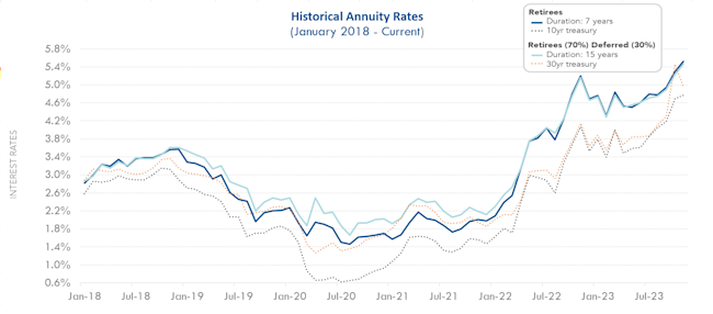 Annuity purchase interest rates and treasury yields continue to demonstrate variations over time. In 2023, we have observed an overall upward trend in both annuity purchase interest rates and treasury rates. Since last month, the spread between the 10-year treasury rate and 30-year treasury rate shortened, placing the two rates 19 basis points apart. Since the beginning of the month, both the 10-year and 30-year treasury rates have decreased presumably due to easing inflation.